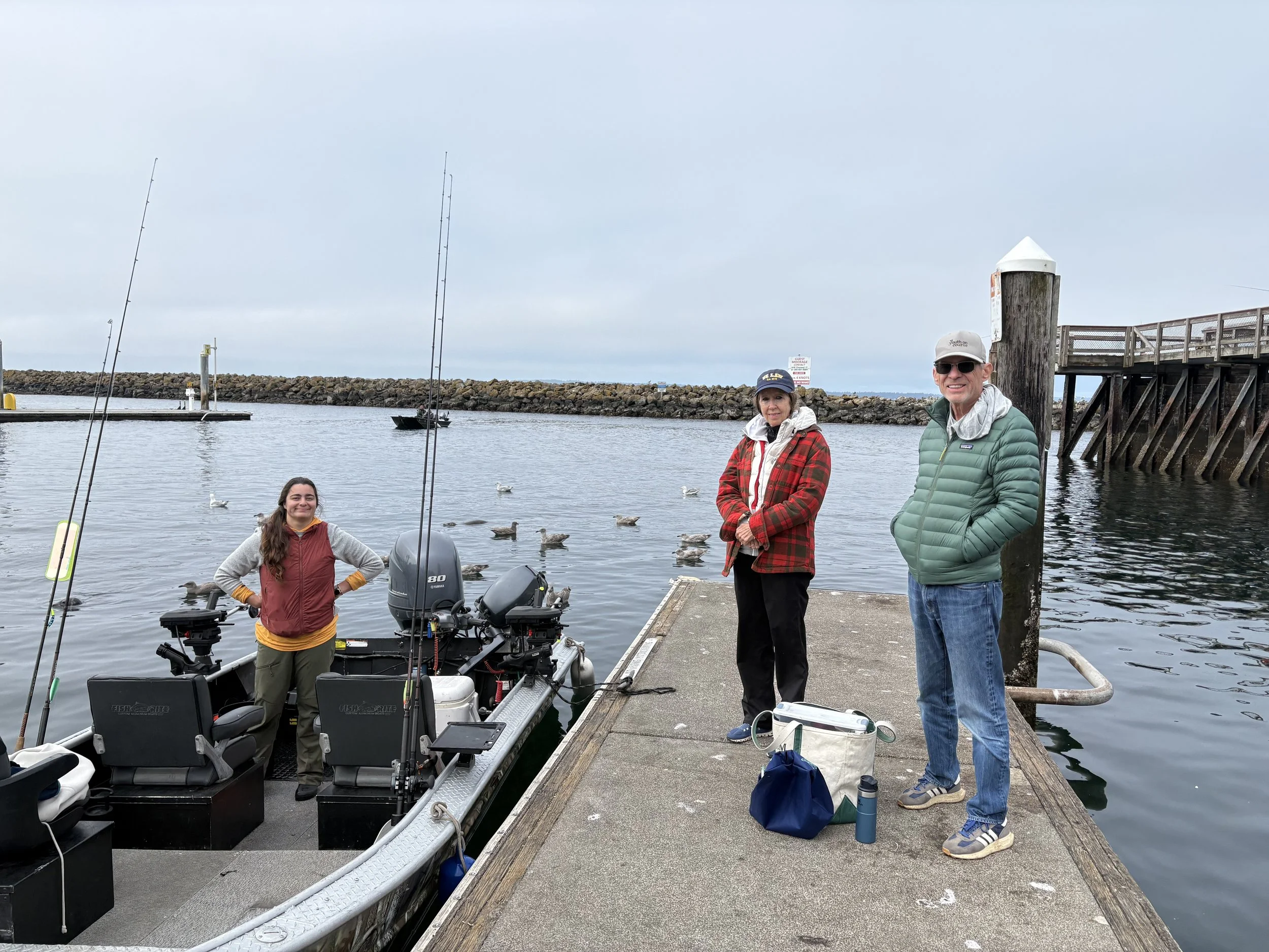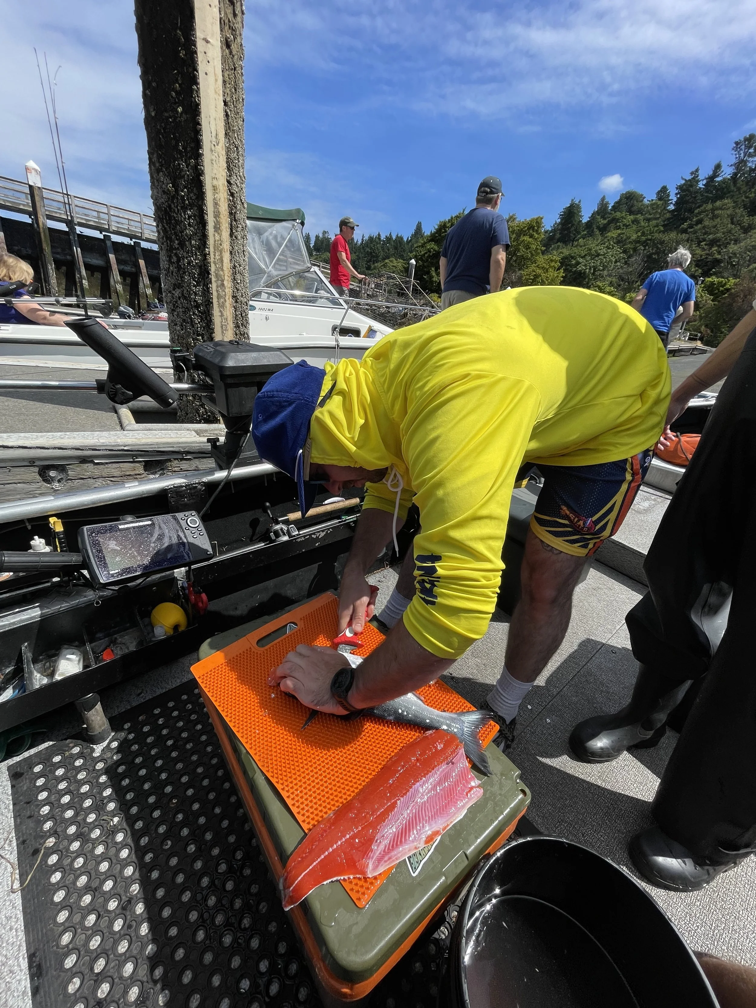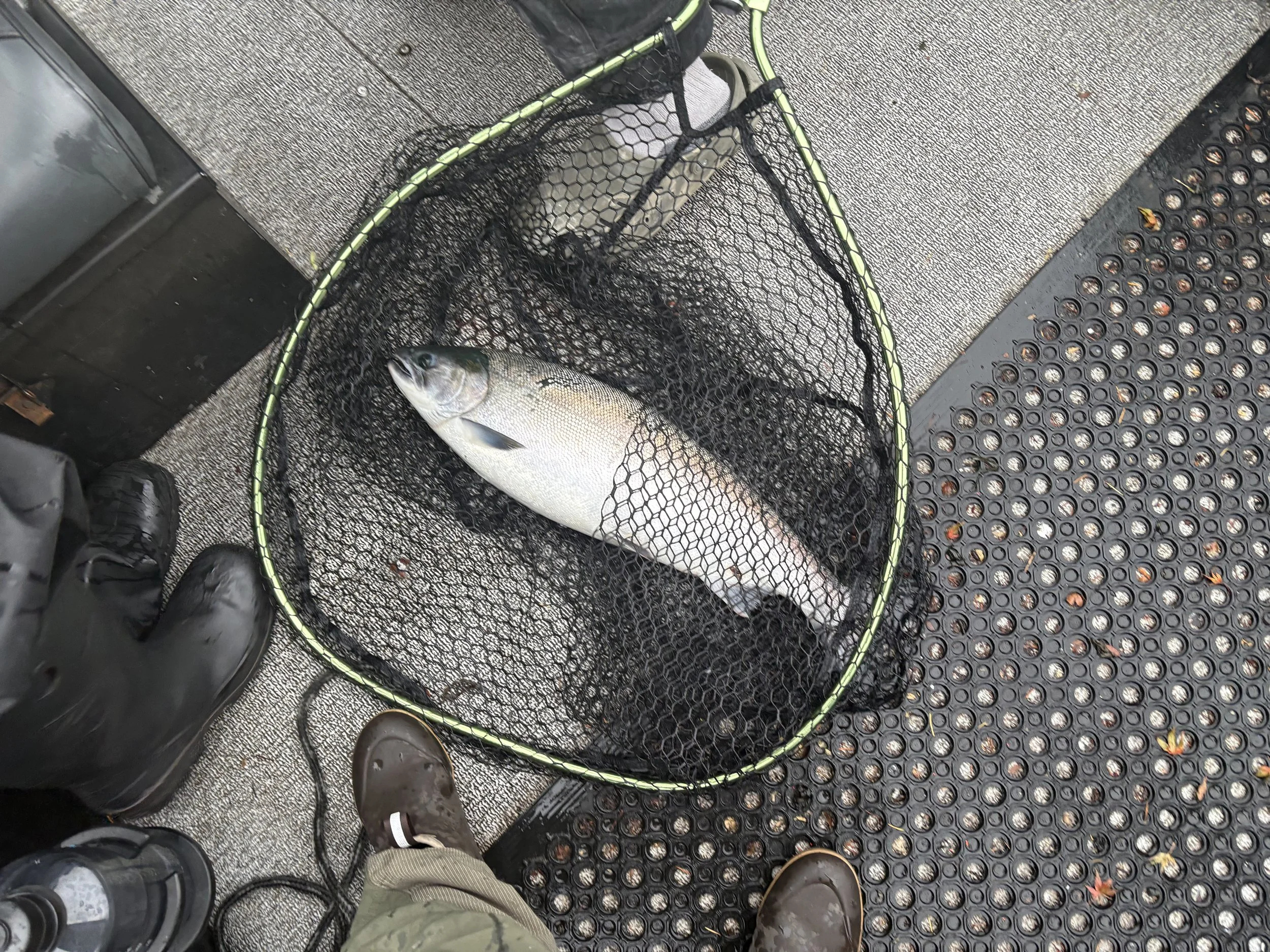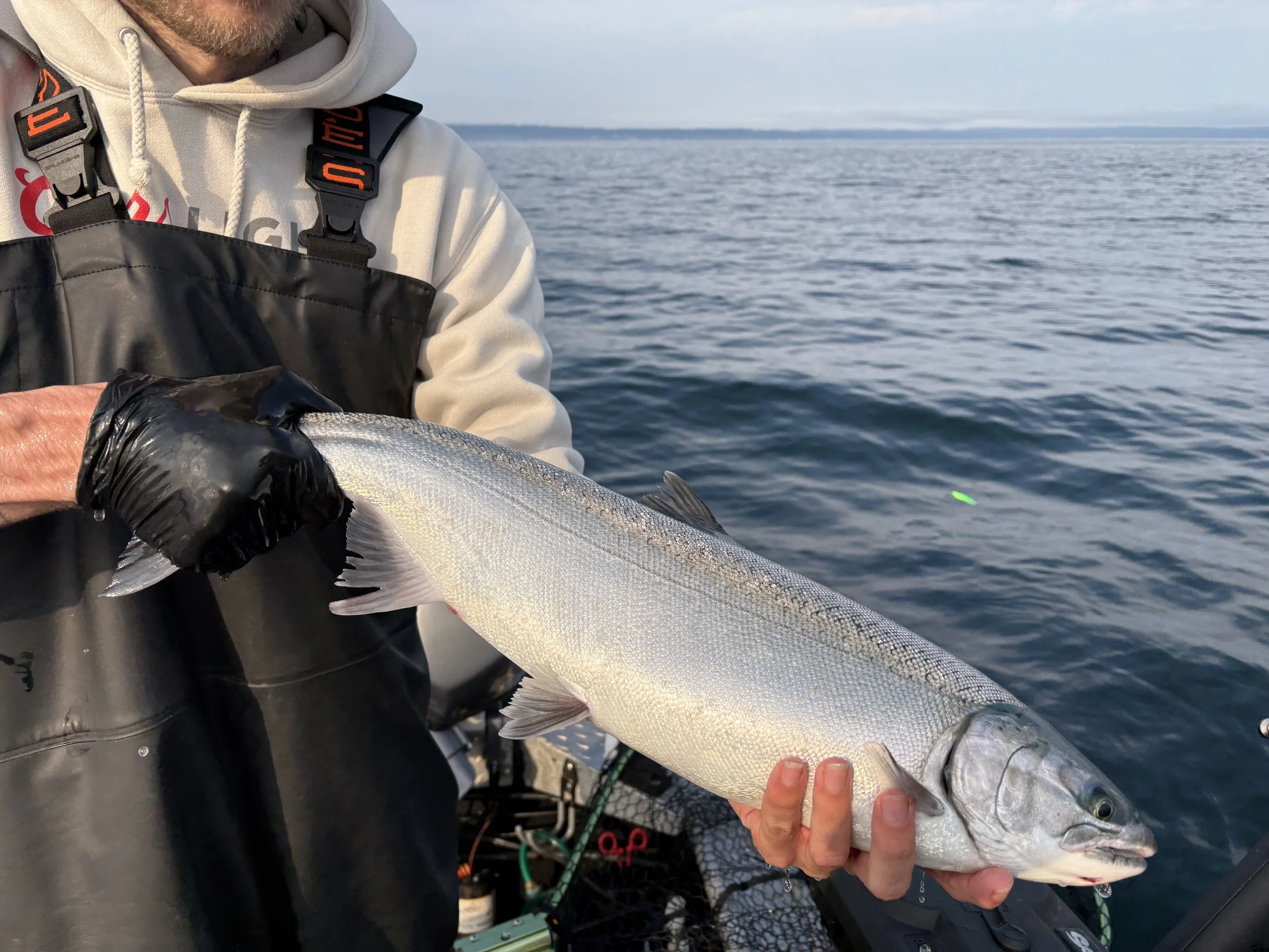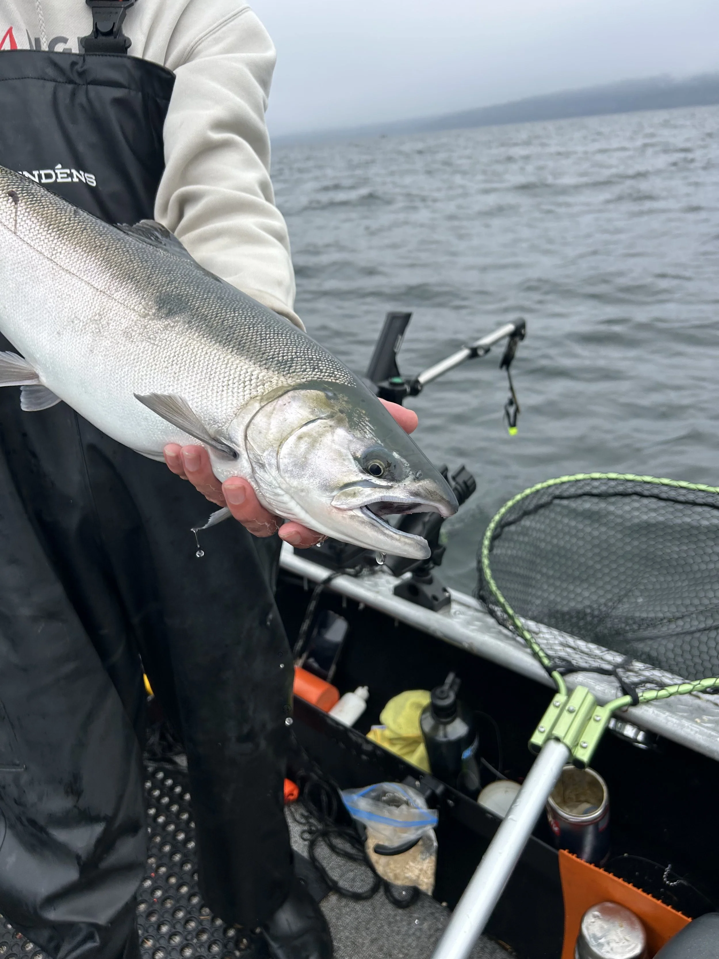 Fishing by 6am. Overcast, few boats, one small chinook and one nice keeper resi Coho. Pretty efficient trip, saw only one other boat net a fish.