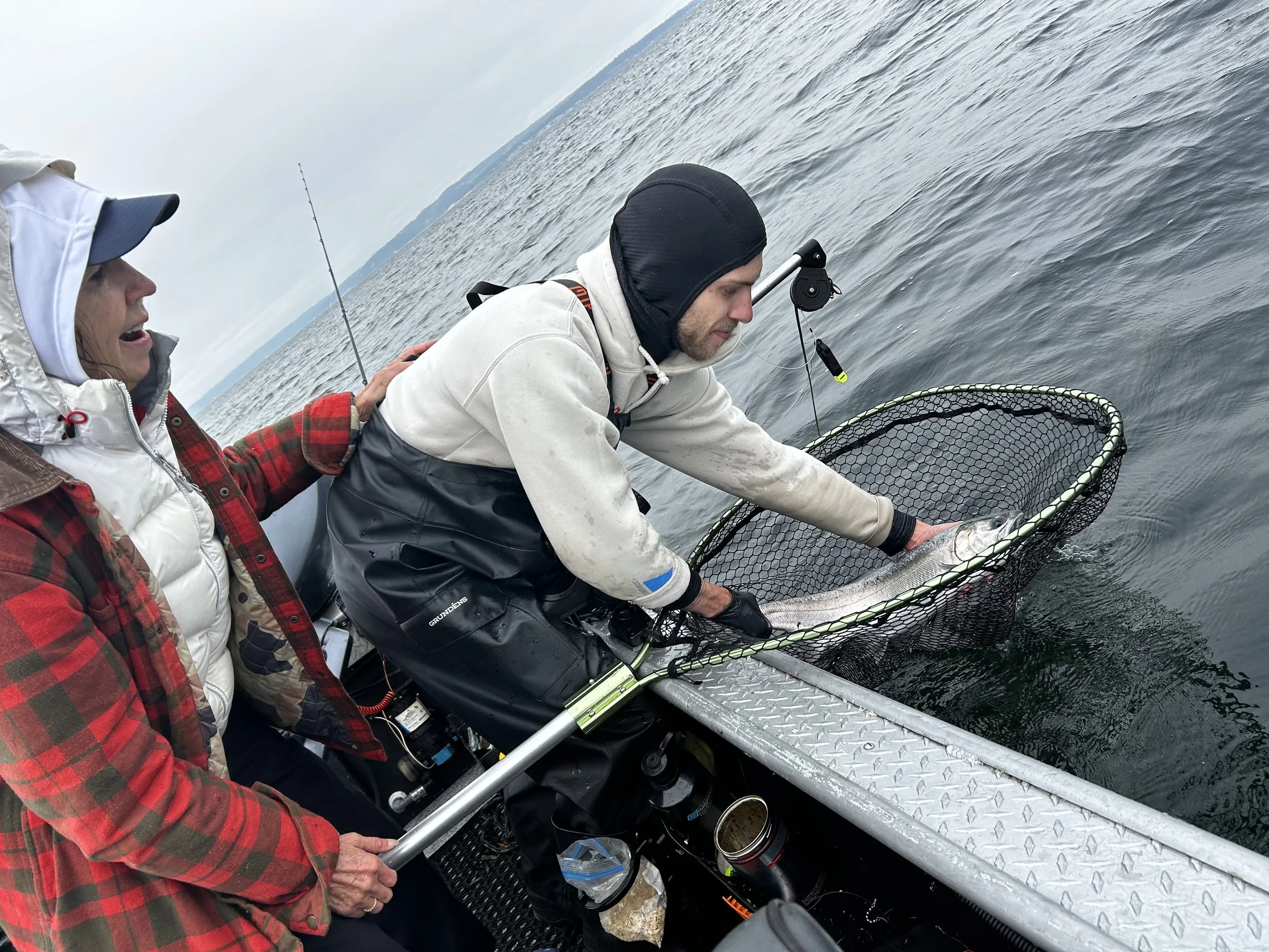 Off Shilshole, wind picked up early around 10. Fished 7am to 10 during slack tide. Conditions were tough, but we landed a small wild resident Coho that we released. Caught on a size 3 Spin N Fish. Looks like other boats that started earlier limited or caught more than us.