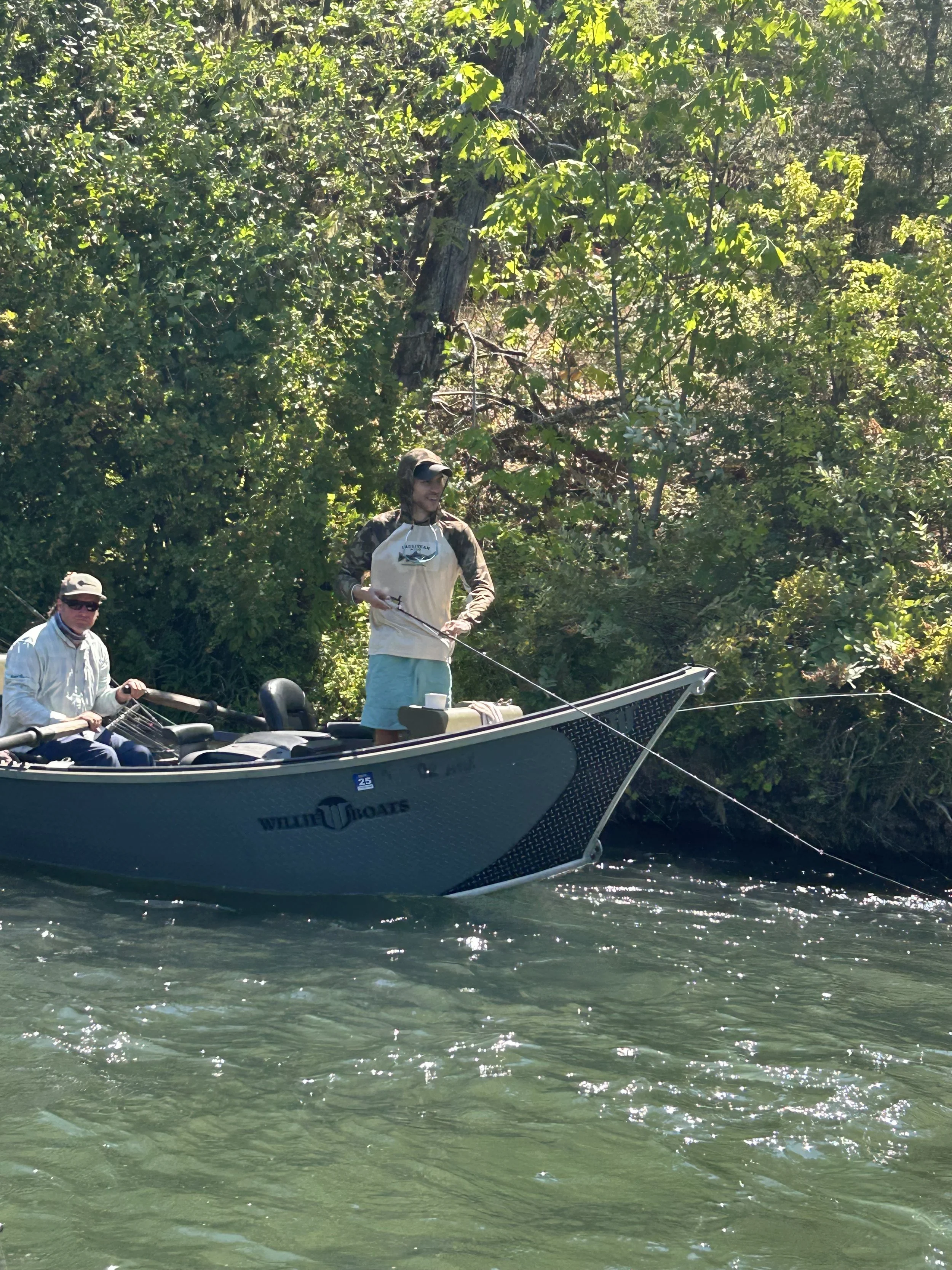 Very hot day. No crowds. My family and I set off in search of summer steelhead with three guides. I was in a boat alone with Jake Lowry, a truly excellent guide. In his custom Willie, we pulled plugs almost all day and landed a bunch of smolts and juvenile trout, with a couple of adults lost and one landed. Jake showed me the thrill of plugging with fly rods, such a cool technique that I will definitely try on our local rivers on the OP. Despite the high temps, all the released fish were safely released.