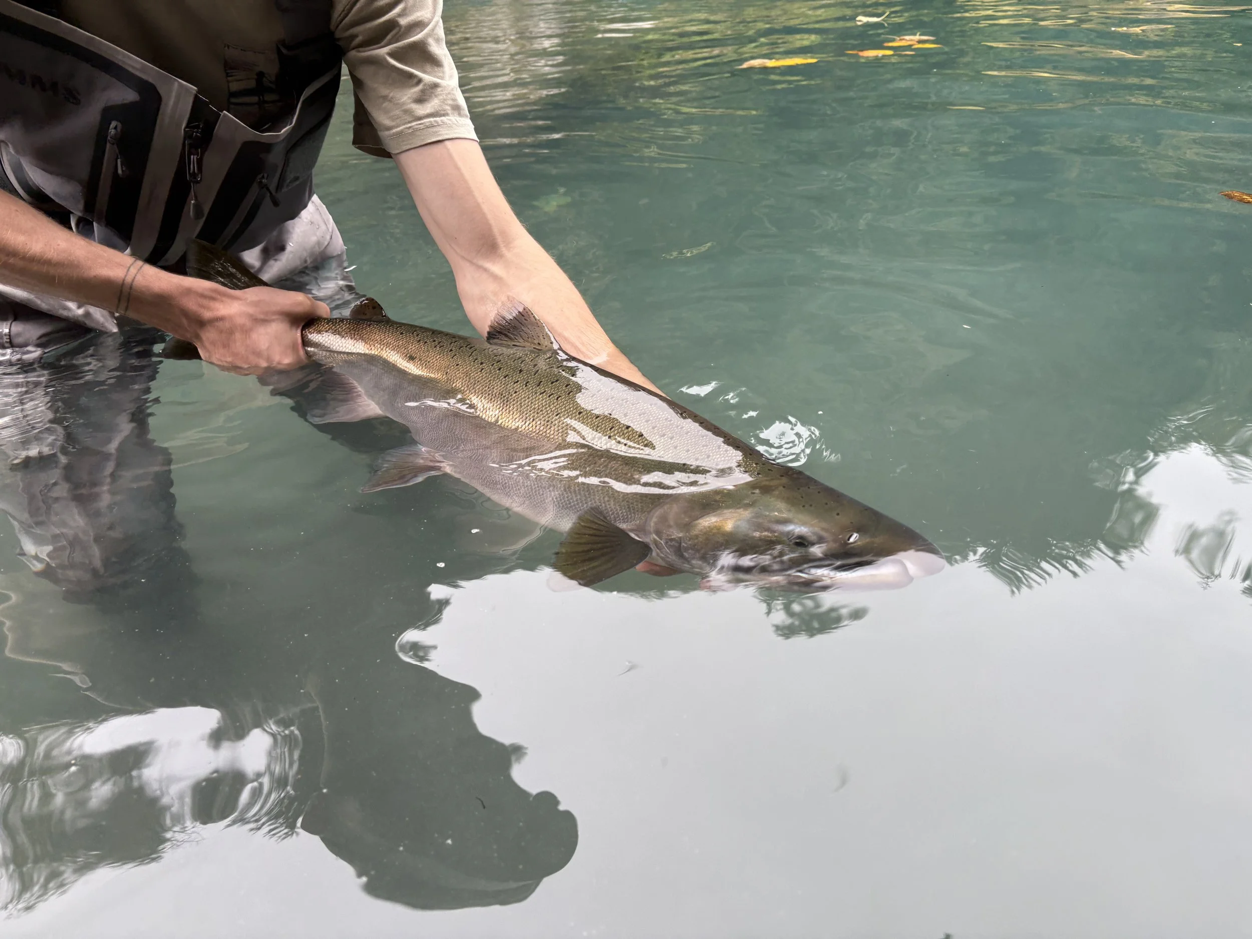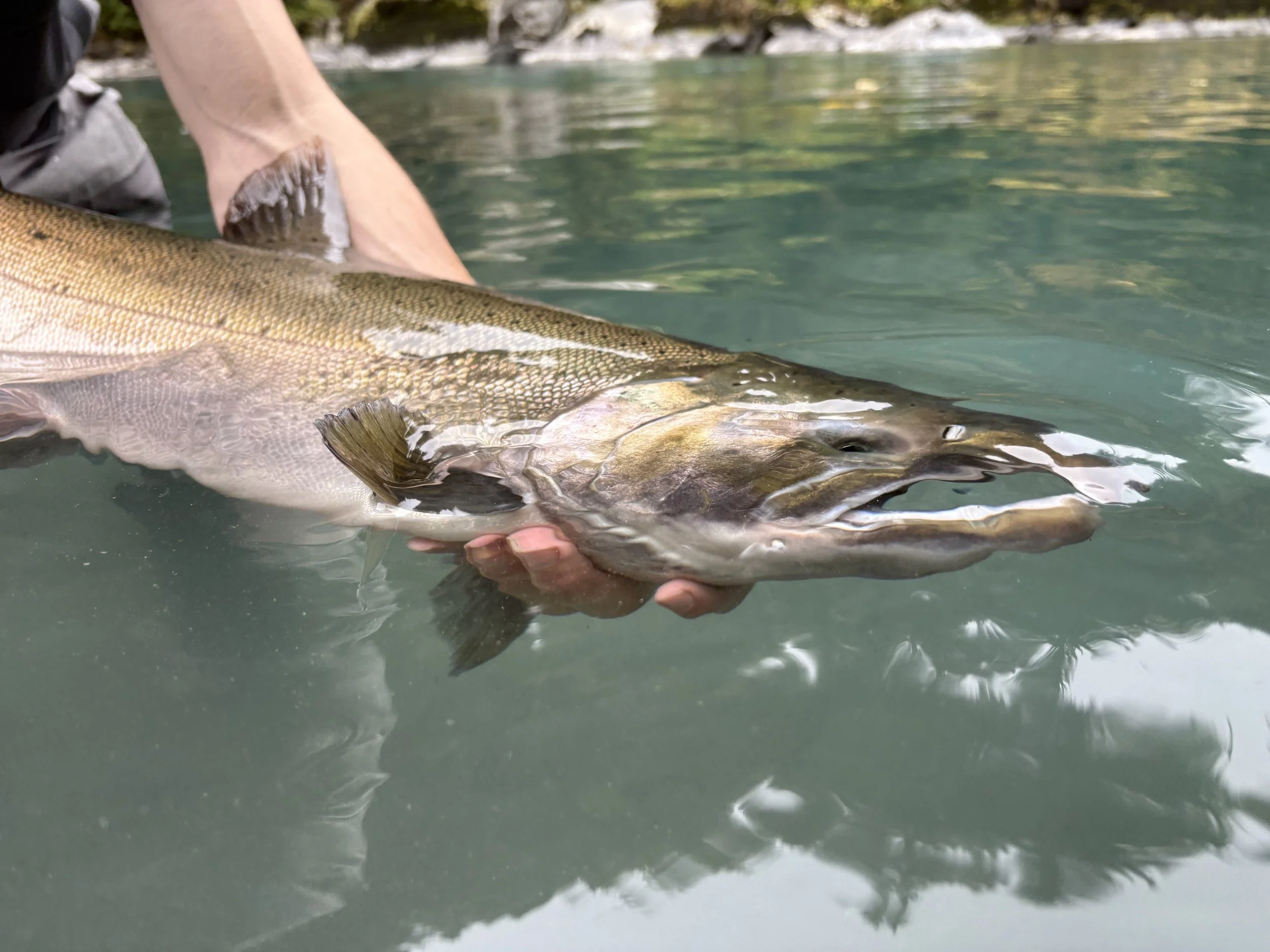 River around 300 CFS. Visibility good. Coho rolling consistently on far bank. Several anglers out on the bank with us. Teagan hooked into a large spawny coho. Flares of red and black on the beast and had good fight in him. Teagan fought him to the bank, and he made several runs and jumps. He spat the hook out and it rehooked in its Dorsal fin. He came off before we could get a picture. First freshwater salmon of the season for us. Caught early evening.