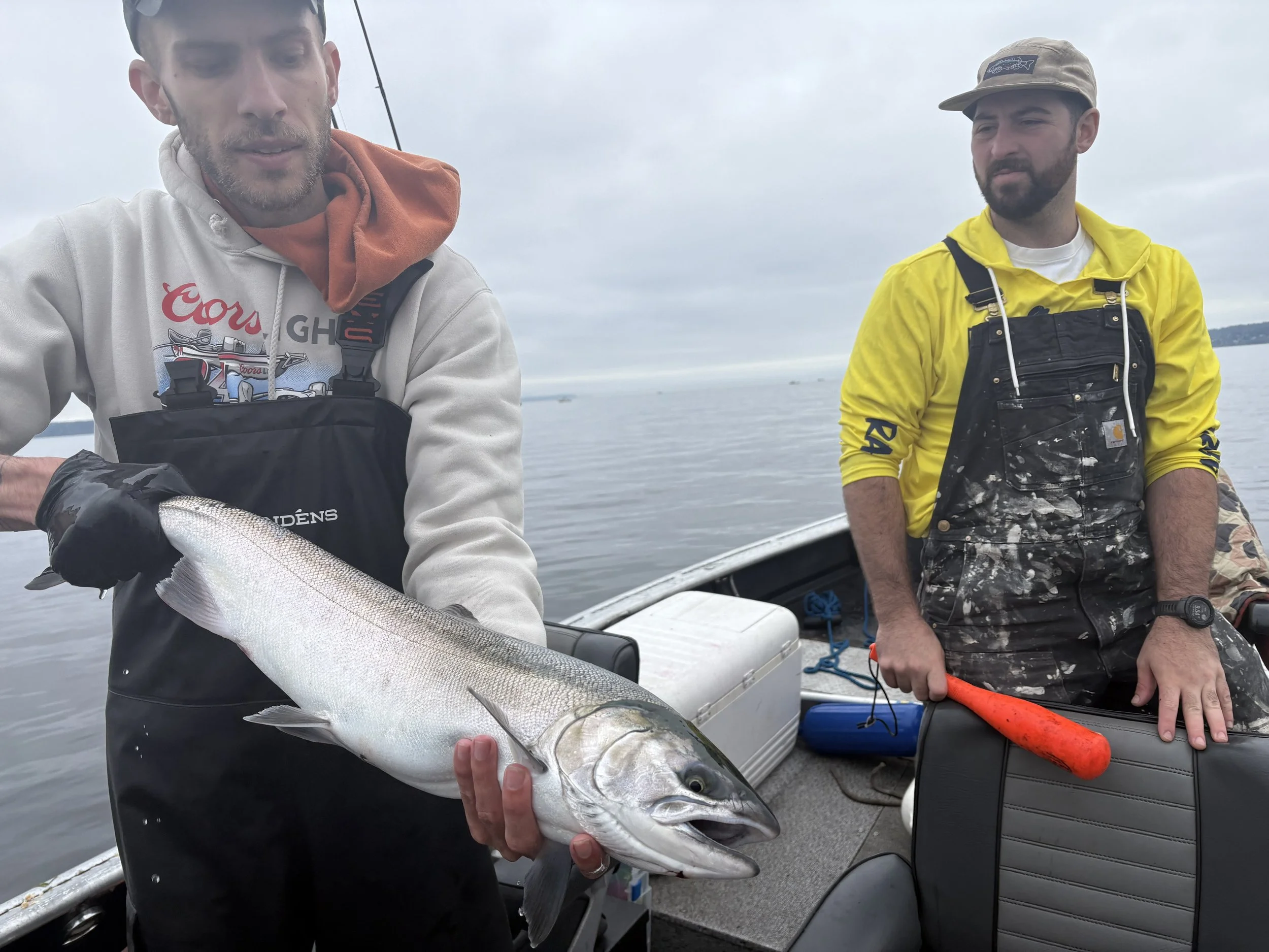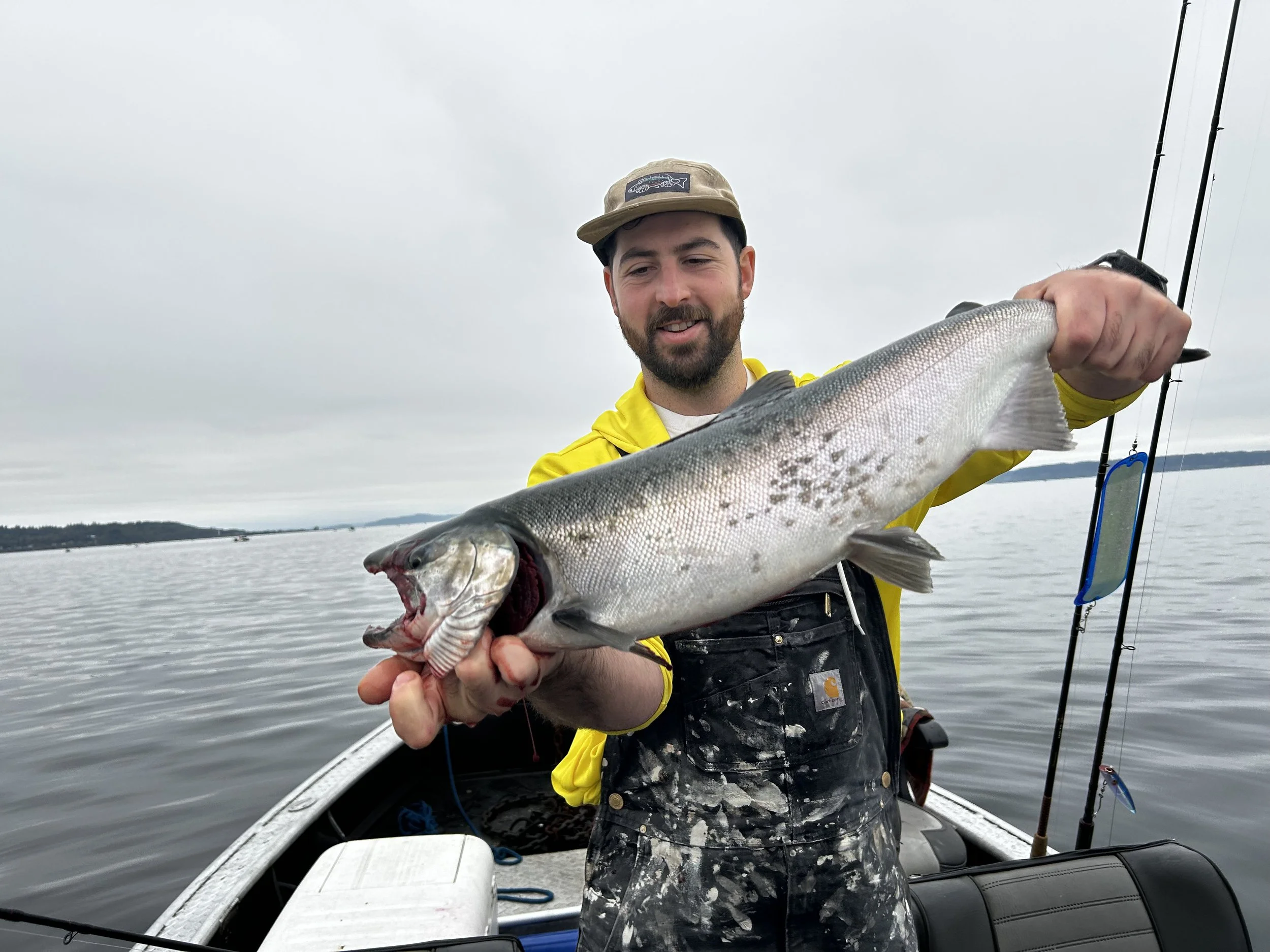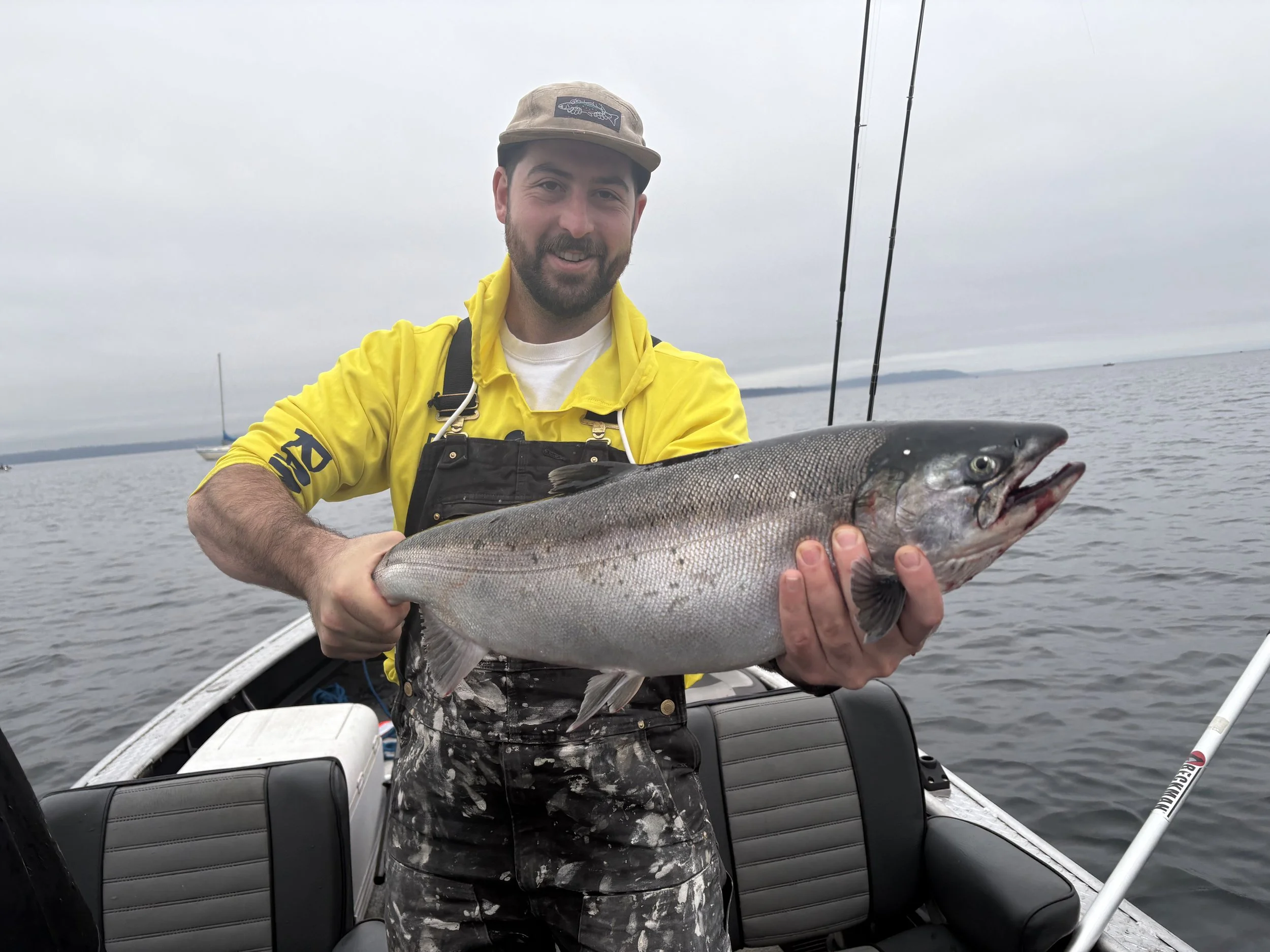 Out early (for us) around 6am with Toby and Gareth. Fished for a 15 min around Shilshole and then motored out to Jeff Head where we came across a flotilla of salmon anglers. Right away we knew the fishing would be good. Overcast skies, calm water, and tons of fish and bait on the finder. Landed two wild resident coho and three wild chinook, with a couple more lost at the boat. Overall awesome day!