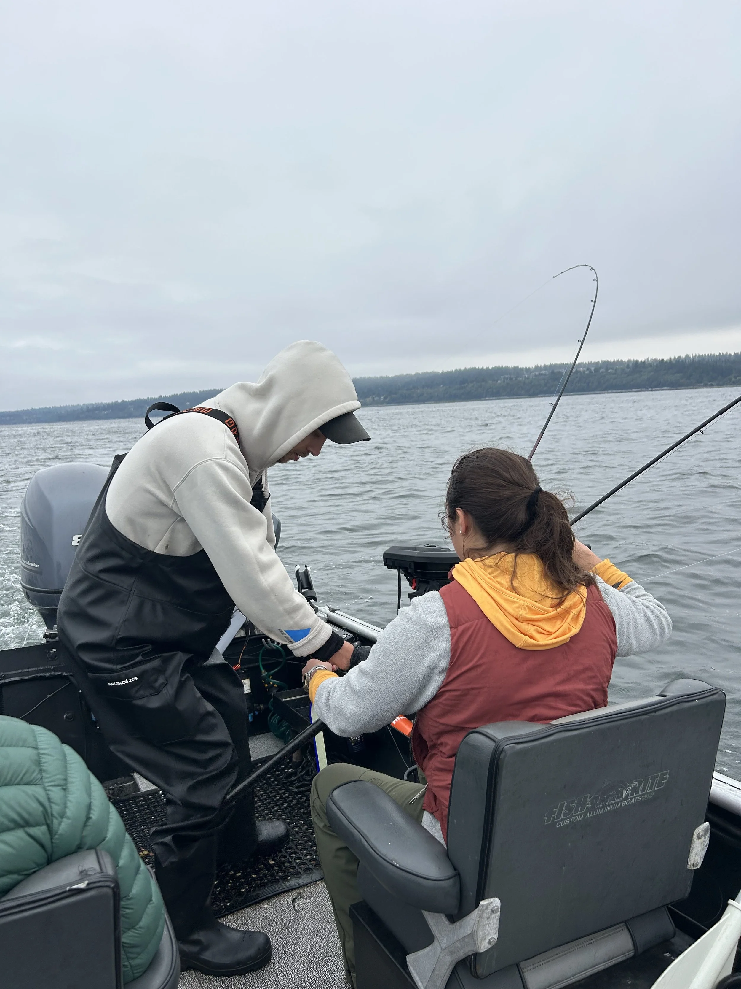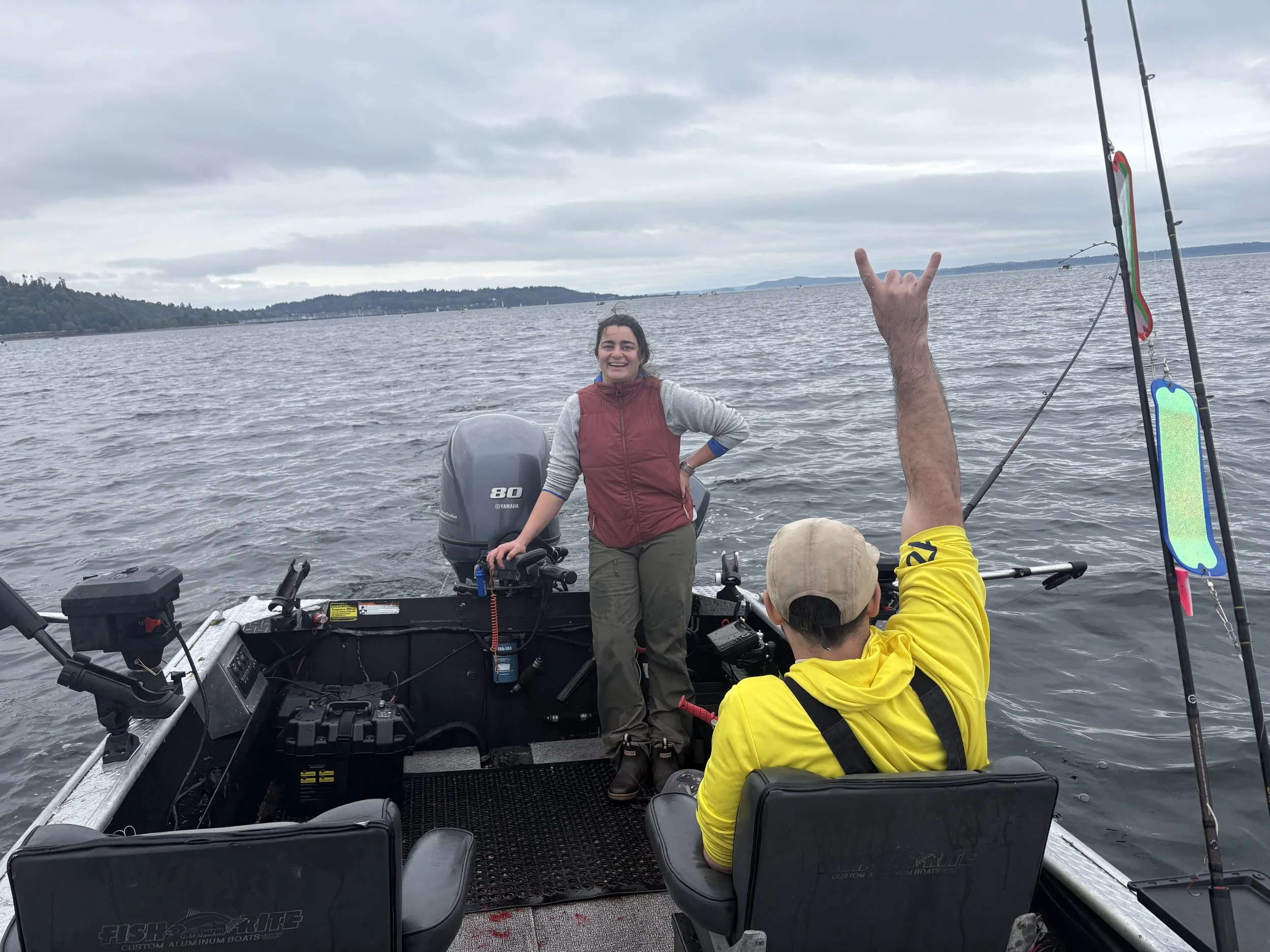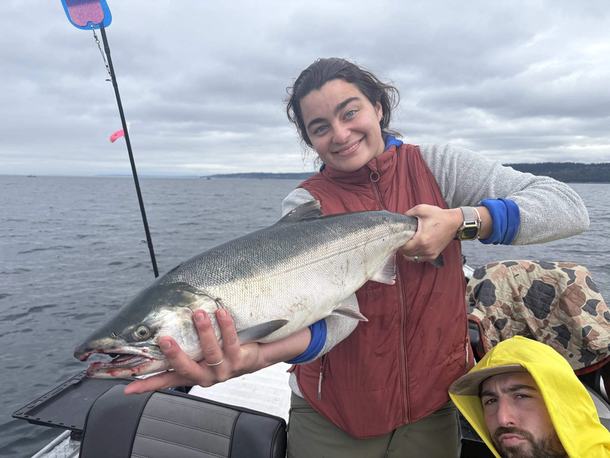 Out early (for us) around 6am with Toby and Gareth. Fished for a 15 min around Shilshole and then motored out to Jeff Head where we came across a flotilla of salmon anglers. Right away we knew the fishing would be good. Overcast skies, calm water, and tons of fish and bait on the finder. Landed two wild resident coho and three wild chinook, with a couple more lost at the boat. Overall awesome day!