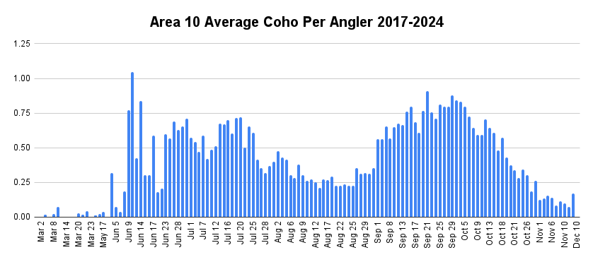 At work dreaming of the upcoming Coho bite so I threw together some charts about the last 8 or so years of Coho fishing in Area 10. These charts are using the creel data sampled at Shilshole Launch.