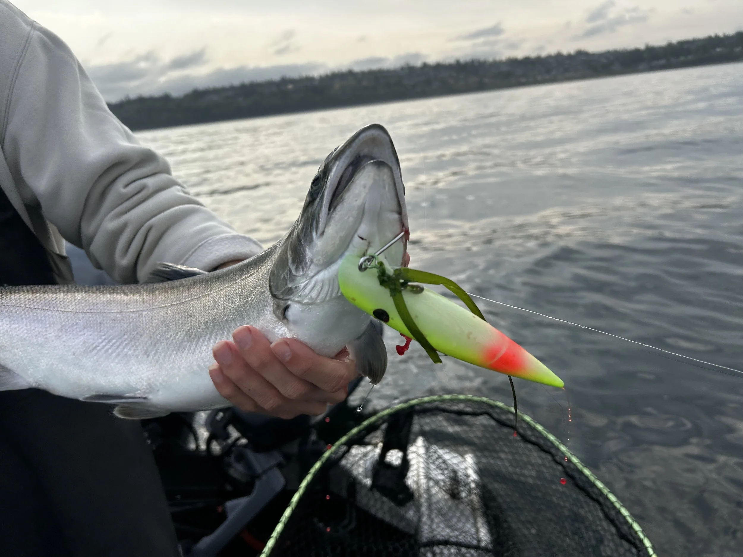 Solo trip, started a bit late around 7am, caught two pinks almost immediately then switched gear and tactics to target coho. Still residents only but managed to hook a really nice one on a Tomic plug right before heading in….such an awesome fish, and only our second catch on a Tomic. I think if you want to target bigger fish amidst all the pinks, the 4+ inch Tomic plugs are a good bet. Also had to up my troll speed to upwards of 4mph with the Tomic to get the desired action…and caught the coho trolling against the current.