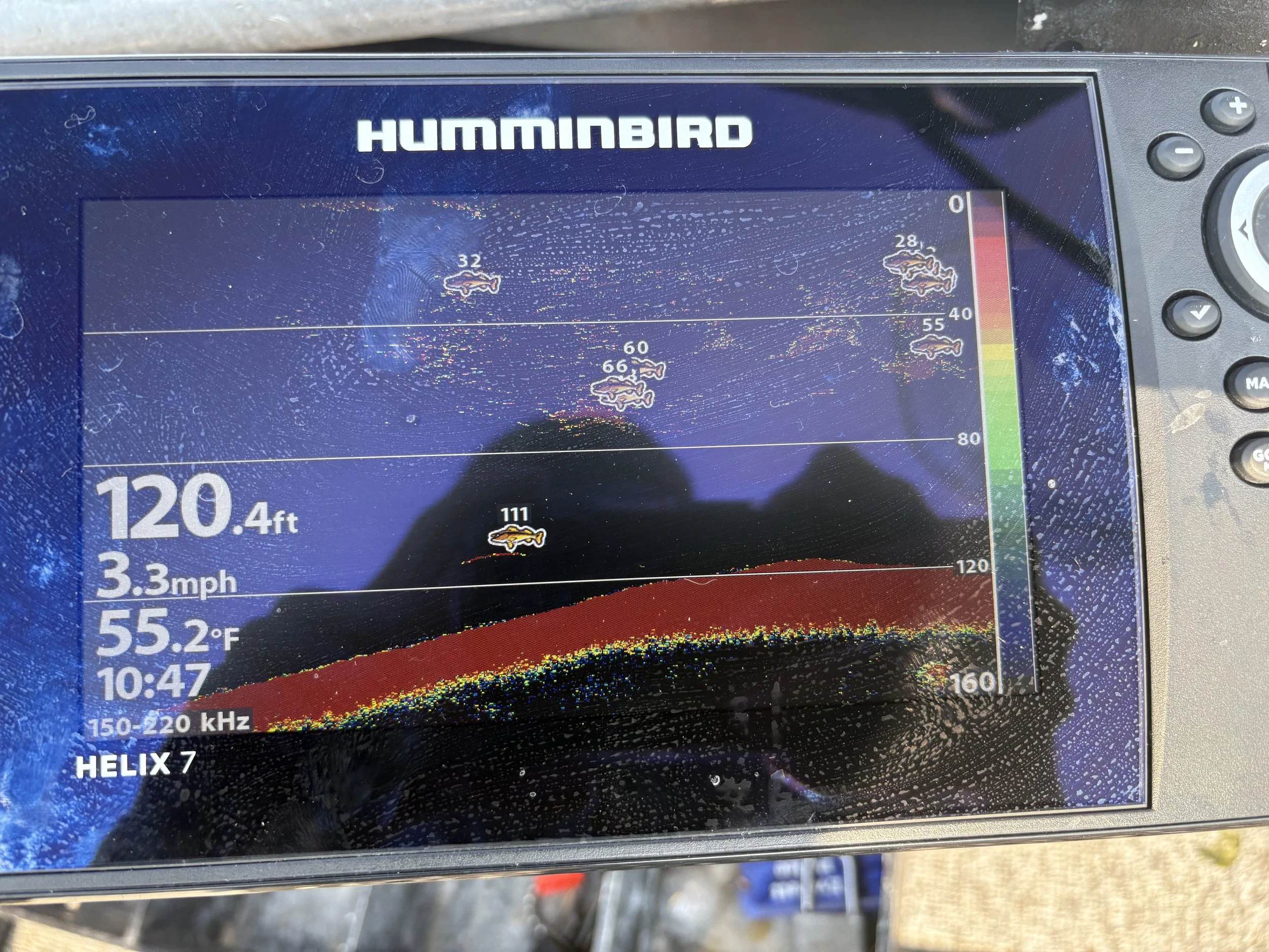 Solo day, lost two resident coho and landed this beautiful hatchery chinook. This guy put up a crazy fight and jumped a foot out of the water a couple times. Boat next to me started cheering when I finally landed him alone, super memorable! Hard to tell from this picture, but he was likely around 12 lbs. Ran a green and white Brad’s SuperBait behind a flasher. Image of fish finder shot around 9am.