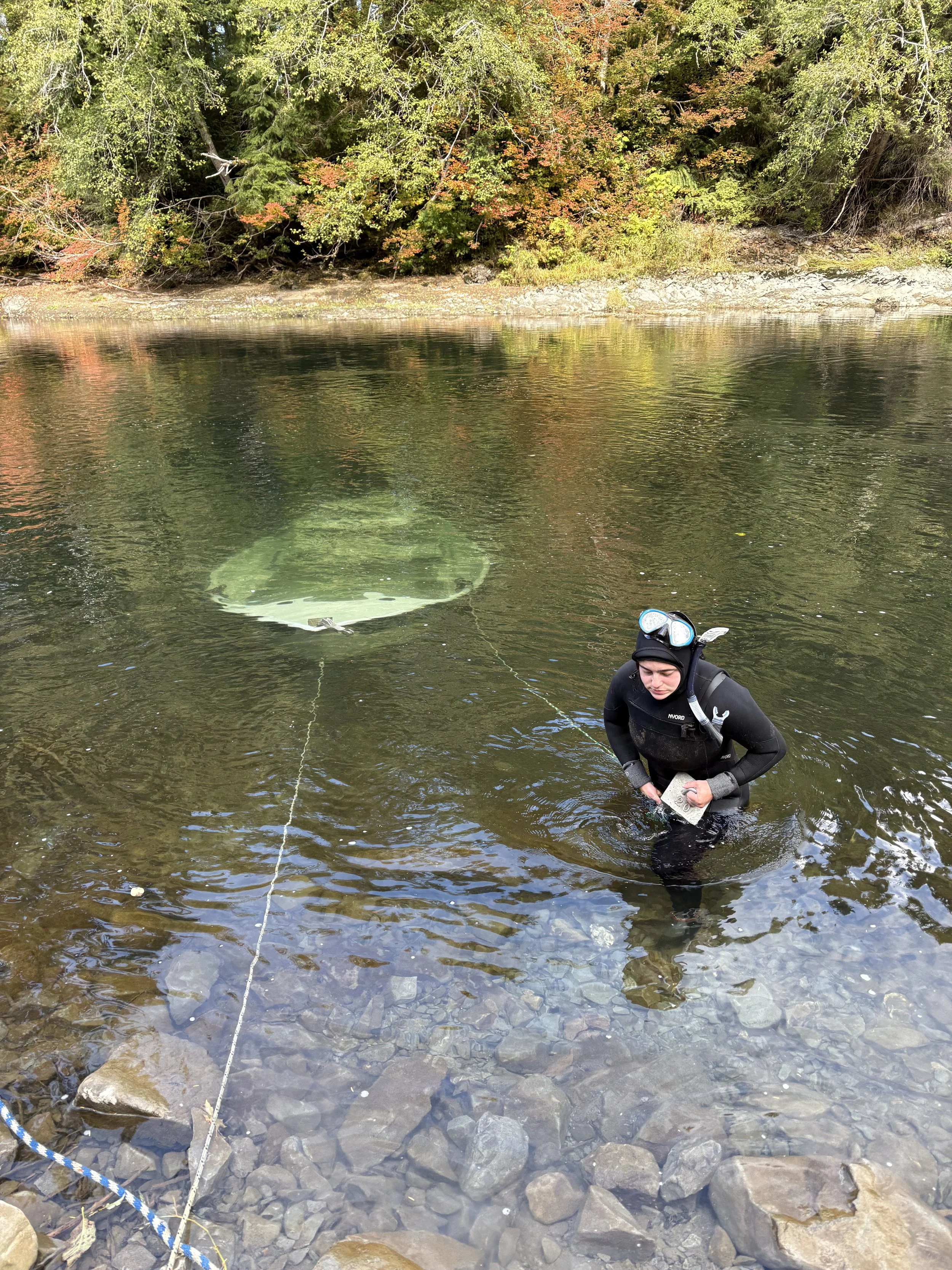 Teagan is the better swimmer and the better diver, so she would be the one to suit up. Luckily, the wetsuit we rented for 20 bucks was a pretty good one. It was thick and had a hood, which would almost surely protect Teagan from the icy temperatures of the water. After wiggling and squeezing into the tight fitting wetsuit, slipping on water socks, sliding on diving gloves and cinching the weightbelt around her waist, Teagan was ready to go. She grabbed the line she would bring to hook onto the D ring, and began to walk out to the boat. It was not too far off the bank, maybe about 15 feet. The D ring was the closest part of the boat to us at that point, which was also lucky.