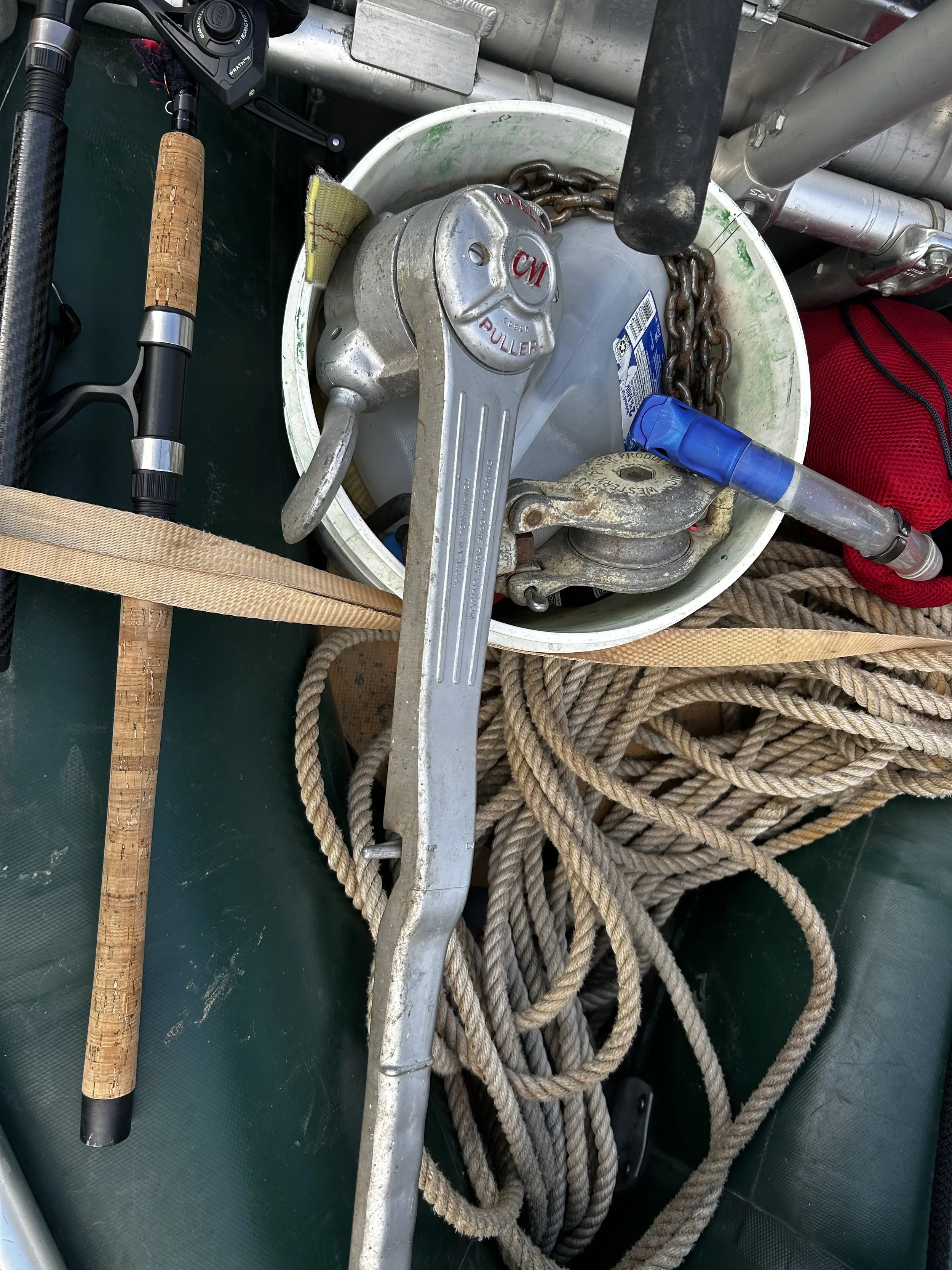 The first approach we tried was to drag a metal hook along the river floor that we had attached to a long strap. This strap could ultimately be fed into a ratchet system to offer us more pulling power, we just needed to hook some part of the boat. We took passes over the boat for a while, maybe 30 minutes or so, getting acquainted with how the current would belly the strap, making it difficult to tell where the hook was. Then on one pass, I noticed my strokes were met with intense resistance all of a sudden. We had hooked some part of the boat. I really couldn’t believe it. I craned my neck around the raft trying to get a glimpse of what it was that we hooked exactly. Oddly enough, I saw one of the boat seat eerily gliding towards us as Teagan pulled on the strap. The seat was wrapped around both the front and rear anchor lines, which our hook had latched onto. We were connected to the boat. We had an avenue to success.